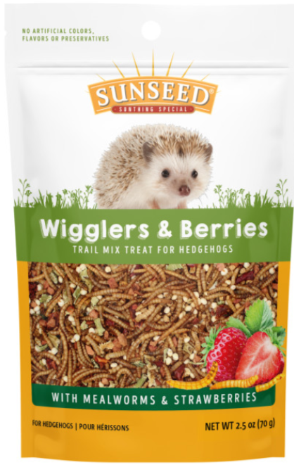 Sunseed Wigglers & Berries are a great supplement to regular daily hedgehog food, This treat is full of dried meal worms - your hedgehog's favorite! These high-protein super worms are mixed with dried egg, and only the tastiest fruits and veggies, like celery, bell pepper, and strawberries. Wigglers & Berries are also a high-protein, yummy treat for other rodents, like hamsters, rats, and mice.