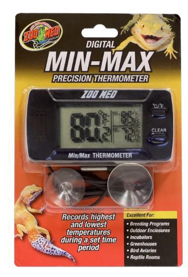 Zoo Med Digital Min/Max Thermometer records highest and lowest temperatures during a set time period. Perfect for incubation, basking sites, hibernation and habitat temperature monitoring.
